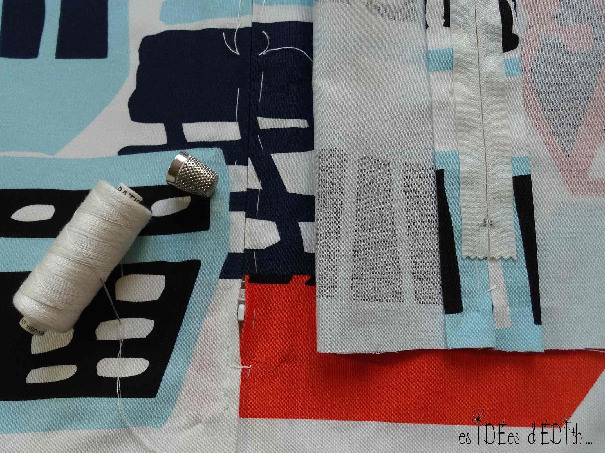 Et surtout, lors de ma quête d’un tissu d’ameublement sympa, j’ai déniché une merveille chez Ikéa : un graphisme contemporain ambiance city, exactement les couleurs que je cherchais, très justement relevées de quelques traits noirs et d’une pointe de vermillon . Le tissu est épais, de qualité, et , ce qui ne gâche rien, à un prix imbattable.