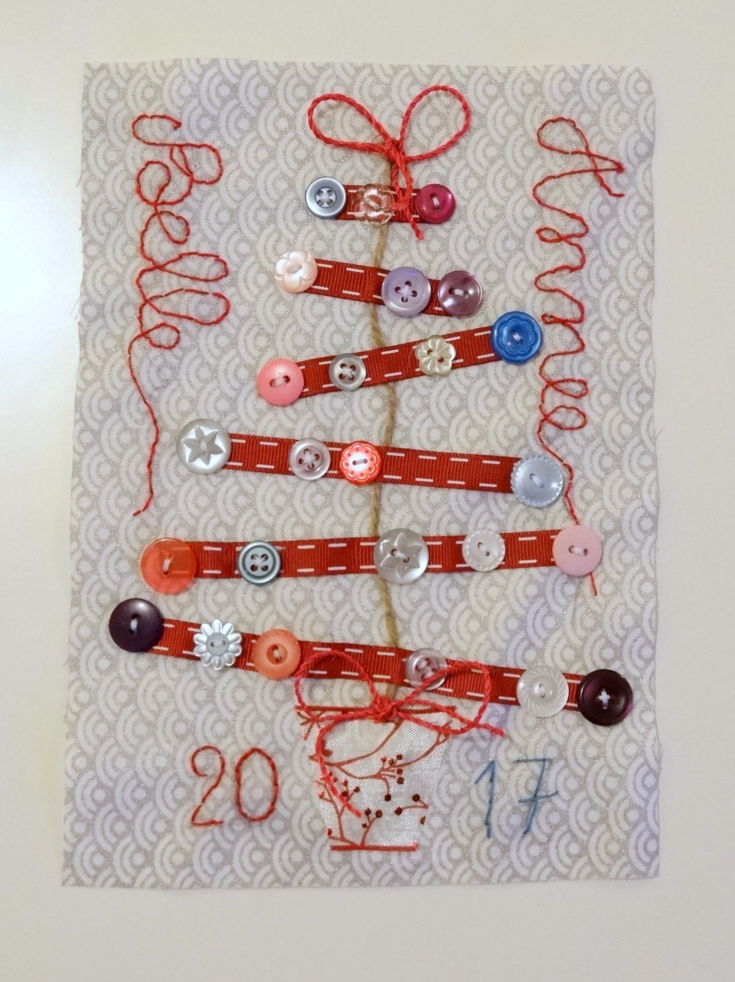 Une carte DIY » Belle Année 2017 » en tissu et boutons à expédier par mail ou par la Poste que l’on aura la satisfaction d’avoir réalisé !