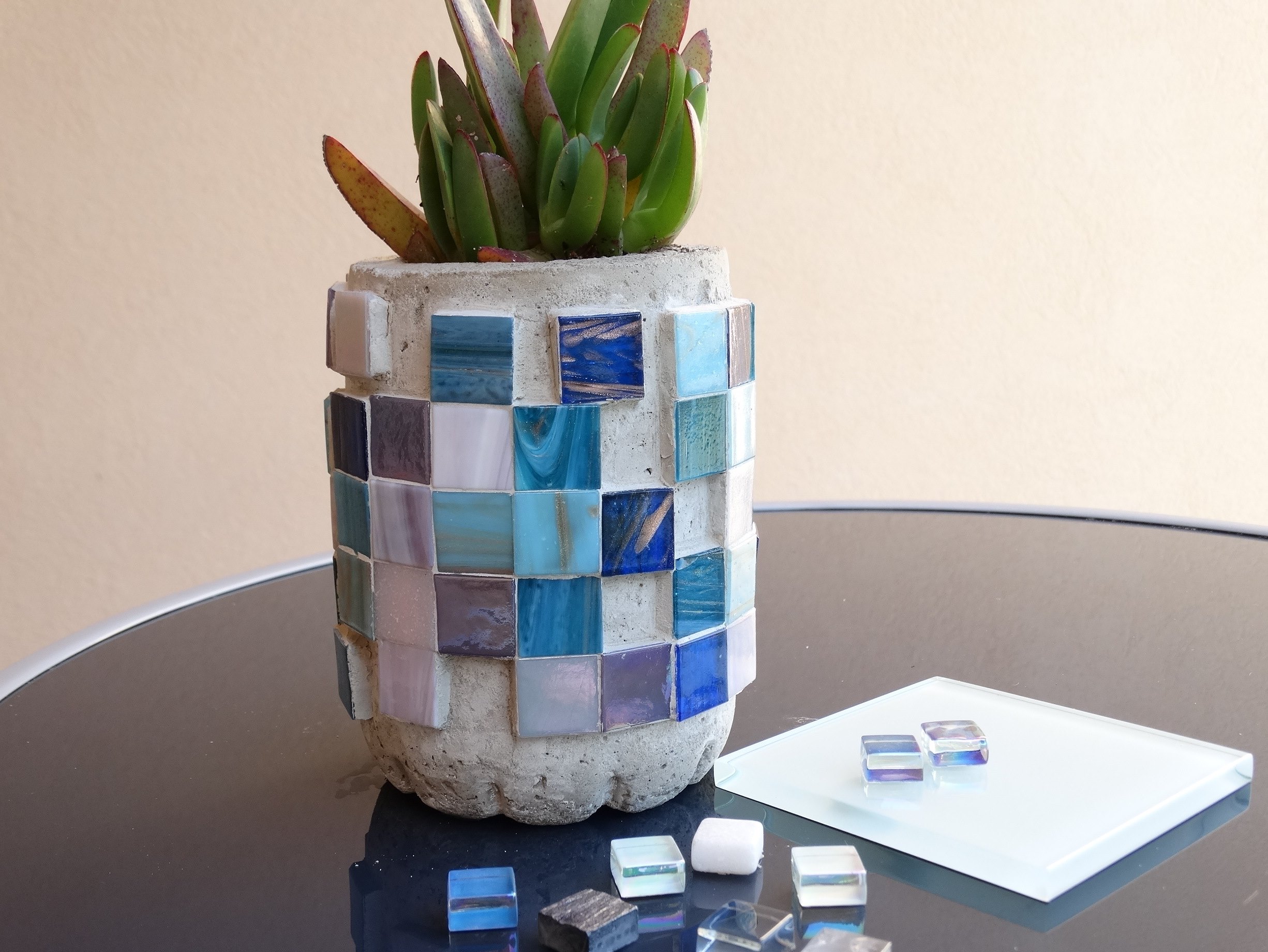 C’est parce que je n’ai que trop tardé à me lancer moi-même que j’ai décidé de vous proposer une Petite initiation à la Mosaïque. La mosaïque est juste une suite logique à la réalisation d’objets en béton qu’elle orne et habille avec style. Tout en maintenant une unité minérale, les petits carrés en pâte de verre aux couleurs chatoyantes, joliment appliqués sur la surface brute du béton, donnent à l’objet comme un air de fête, une valeur ajoutée… du fait main qui plus est !