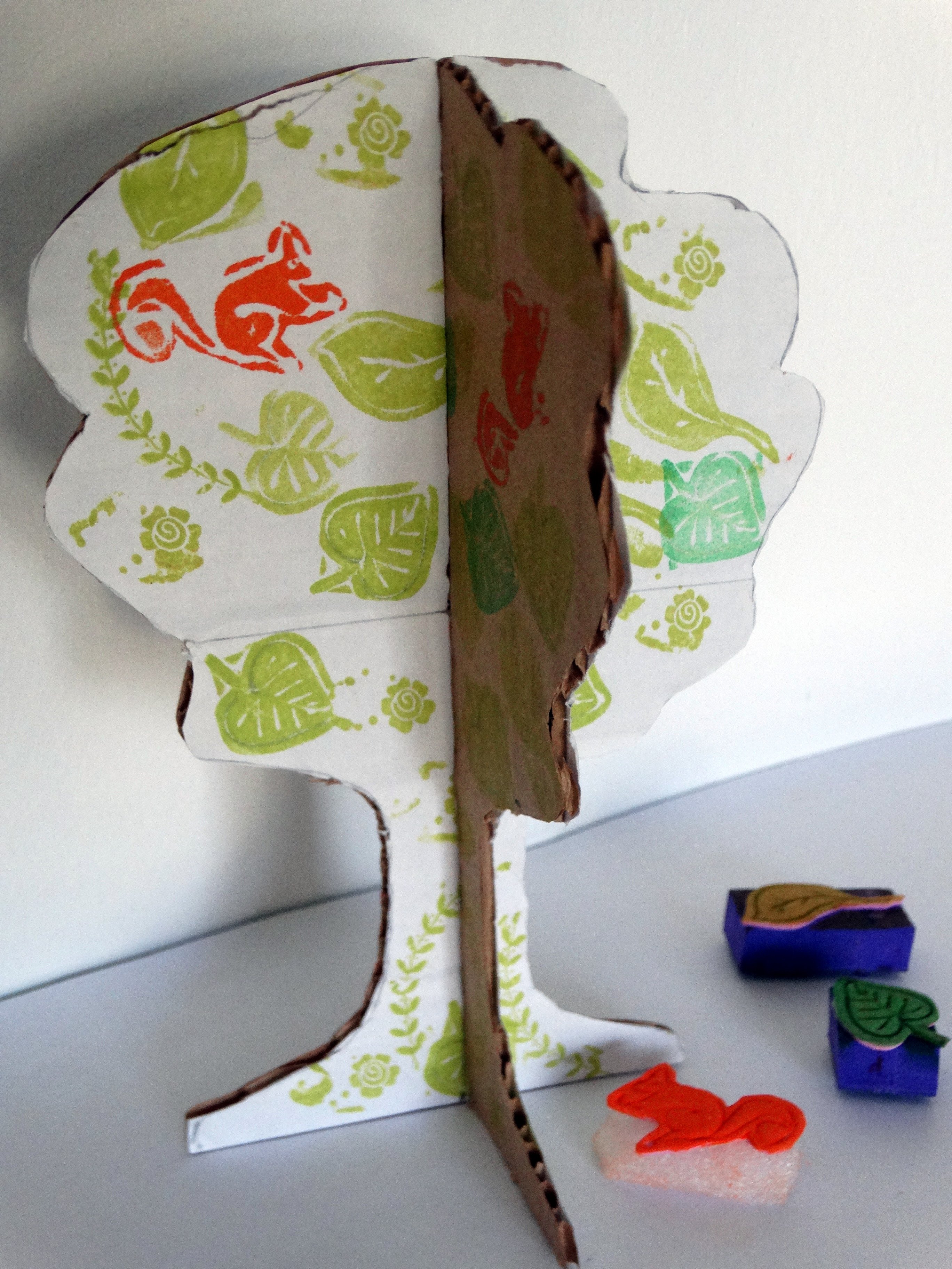 Utilisez des tampons encreurs ou de la gouache (à texture souple, peu diluée) pour orner l’arbre, les 2 pièces bien à plat sur la table. N’oubliez pas de les travailler en recto-verso et laissez bien sécher avant d’emboiter les 2 parties car l’humidité des couleurs pourrait fragiliser le carton.